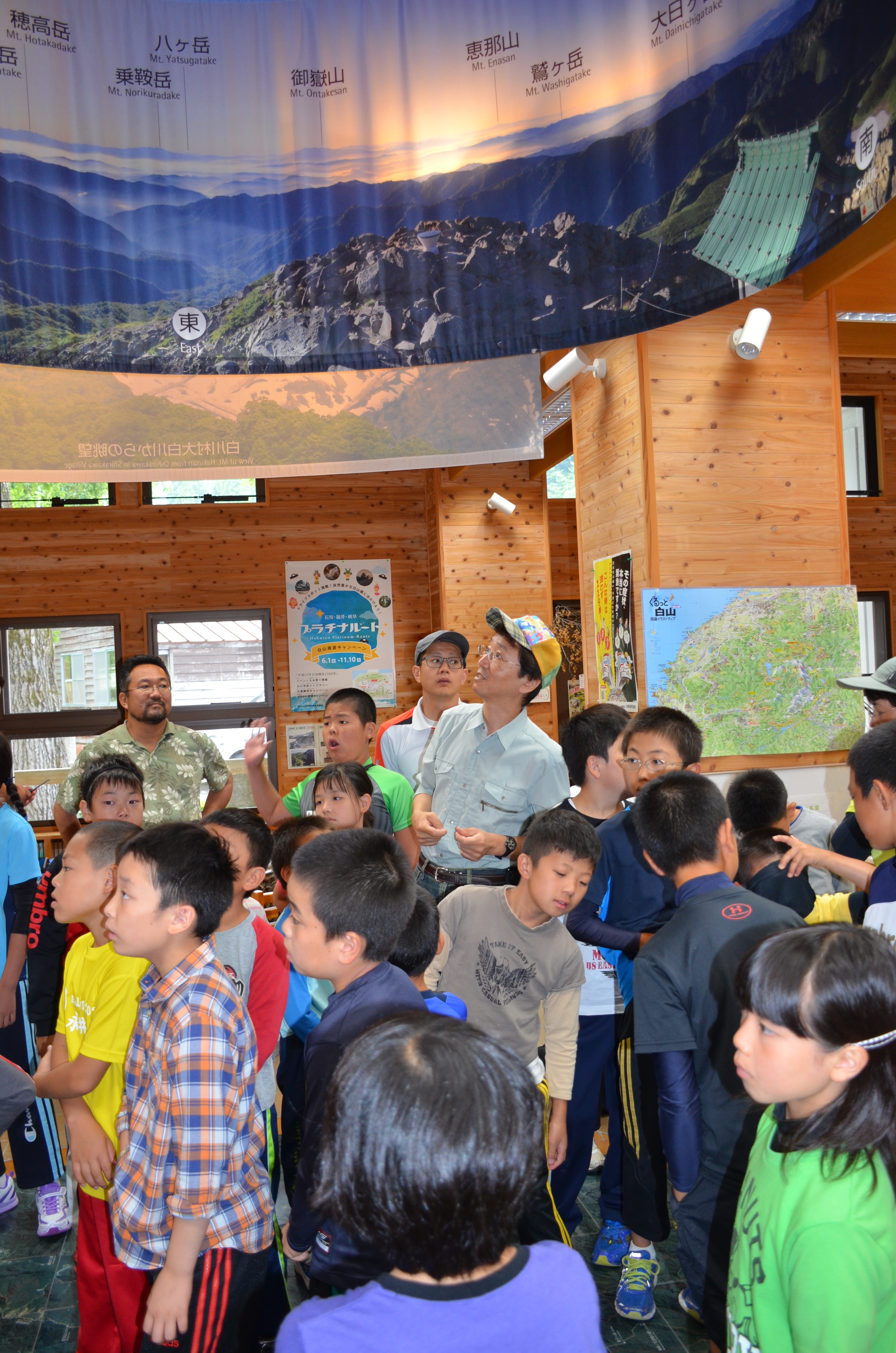 やや厚い雲がかかる山を見ながら9時に白峰小学校を白山市のマイクロバス2台に乗り、出発しました。途中、昭和9年の大水害による土石流で流れ出た百万貫の岩を横目に見て、市ノ瀬ビジターセンターに到着しました。市ノ瀬ビジターセンターでは天井に展示された山頂からのパノラマ写真を見ながら山頂付近の火山活動について振り返り、床に印刷された衛星写真で白峰小学校や市ノ瀬ビジターセンター、白山山頂の位置関係を確認しました。