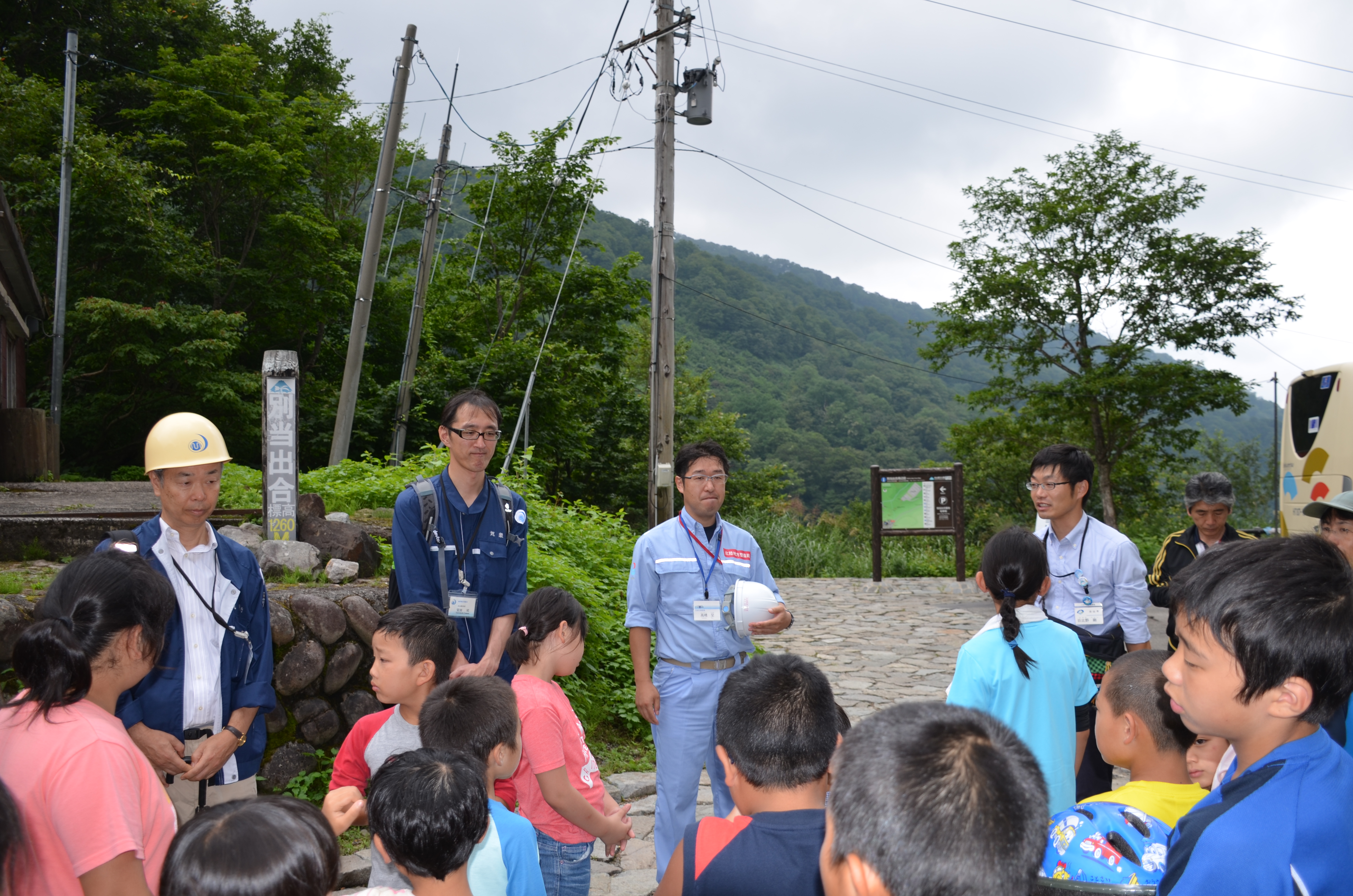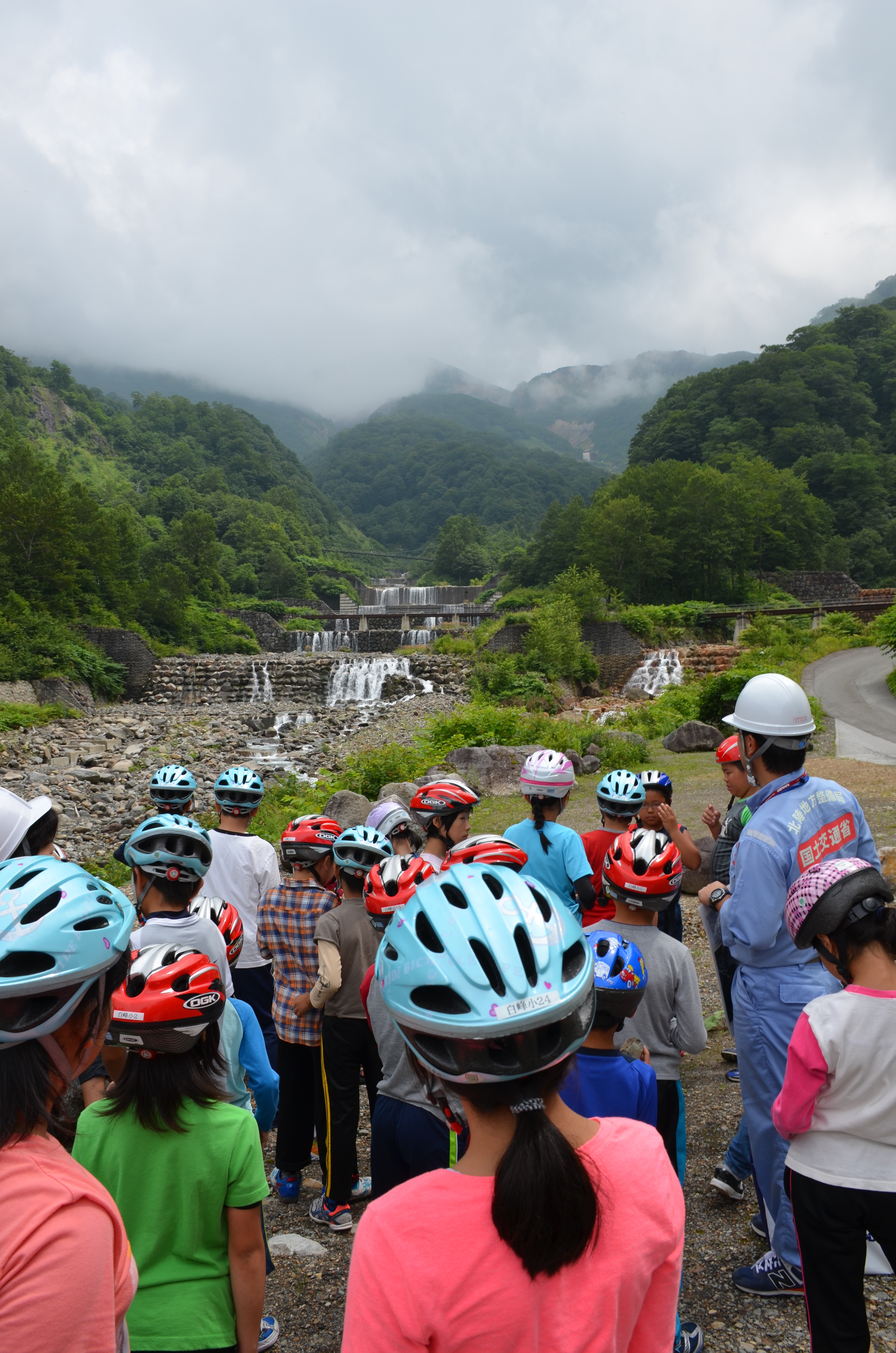 次に、細谷第4号砂防堰堤付近にて高橋流域対策課長から柳谷の砂防工事の全体像の説明があり、尾根全体が地すべりをしていること、またその対策として深いトンネルが掘られていることを学習しました。この場所からは昨年度の白山登山で渡った吊り橋が遠目に見ることができ、そのときの様子を思い出した児童も多くいました。その後、白山の登山口である別当出合に移動し、下山してきた登山者が見守る中で昼食をとりました。