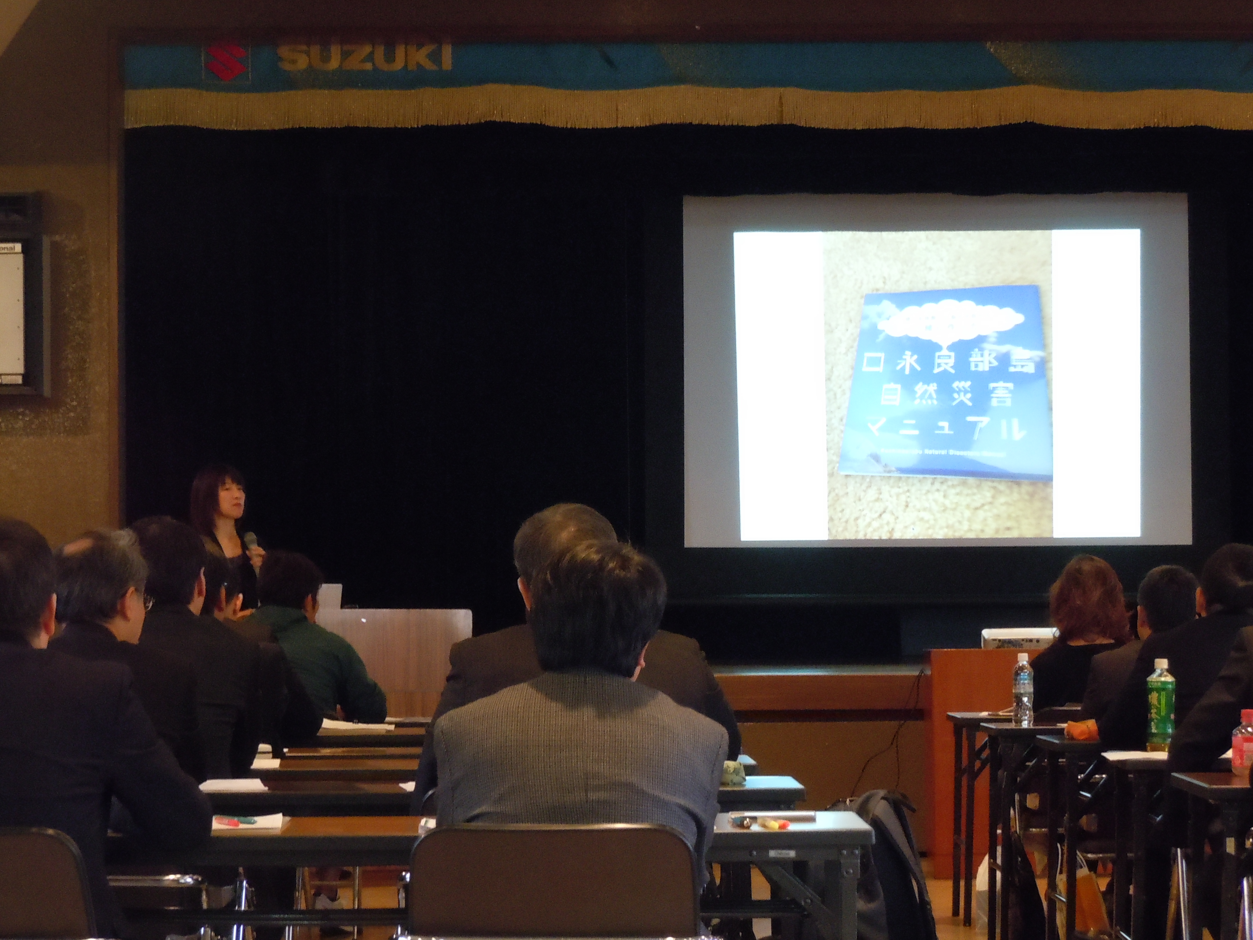 午前中の学習会では、下呂市の防災会議委員でいらっしゃいます兵庫県立大学阪本真由美先生に、最新の御嶽山噴火についての意識調査の結果を踏まえて「火山災害と風評被害」のテーマで、地域が火山と共生するための方法についてお話いただきました。まず、信濃毎日新聞による御嶽山についての住民意識調査から、御嶽山は地域の活性化に良い影響を及ぼしているが、火山であることは地域に良くない影響があるという意見が多かったことが紹介されました。また、2014年の噴火により観光客が激減し、住民の暮らしに影響を及ぼしていることがわかりました。噴火当時の状況についてもご紹介いただき、地震活動は活発化していたが、いつ噴火するのかは観測・監視情報からだけでは判断が難しく、気象庁・行政・住民のいずれもが直ちに噴火するとは捉えていなかったという状況やあまり報道になかった岐阜県側での避難、救助の状況についてご説明いただきました。次に他の火山地域における火山との共生の取り組みとして、口永良部島の避難対応や有珠山の火山マイスター制度、桜島のビジターセンター等をご紹介いただきました。噴火の被害をできるだけ防ぐためには、地域が中心となって、子供への教育、避難訓練など火山と共生していく仕組みを作り、行政や気象庁は、普段から火山についての情報を提供していくことが大切であるとのことでした。 火山との共生が進んでいる他火山の例と比べて、御嶽山は火口と居住地が遠く、住民よりもむしろ他県からの登山客が被害にあう可能性が高いという難しさがありますが、まず、住民の意識を高める必要性がわかり、御嶽山の火山防災に関わる参加者にとって非常に有意義な講演でした。