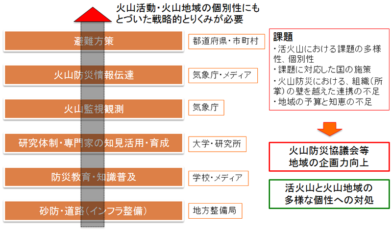 御嶽山の噴火を通して、行政の横の連携が地域防災にとっての問題として見えてきた。 例えば、都道府県市町村は防災対策を行い、気象庁は火山防災情報を出し、監視観測をしている。大学は基礎研究を行い、学校は教育、インフラ系は国土交通省の地方整備局が行うなど、様々な組織が火山の地域防災に貢献しているものの、それぞれの横の連携が十分に取られていない現状がある。 その結果、地元が振り回されてしまうことがある。