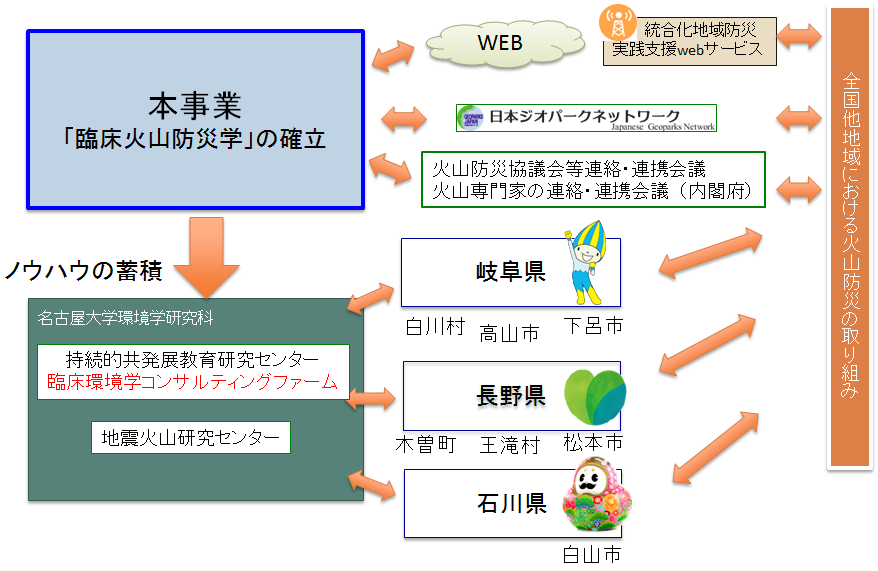 そこで、本課題では、地域が主体となり、国や県とどの様に連携するかを火山や地域の実情に合わせて考えることを目的としている。この課題を検討するにあたって、基本的には、法律で作ることが決まった火山防災協議会を活かした展開を考えている。また、火山には、活火山や火山地域、噴火、さらには地域にも個性があるので、上から一括して展開することが非常に困難であることを踏まえ、地域が主体となって、岐阜県の3つの火山の防災に取り組む体制作りを関係者とともに行いたい。